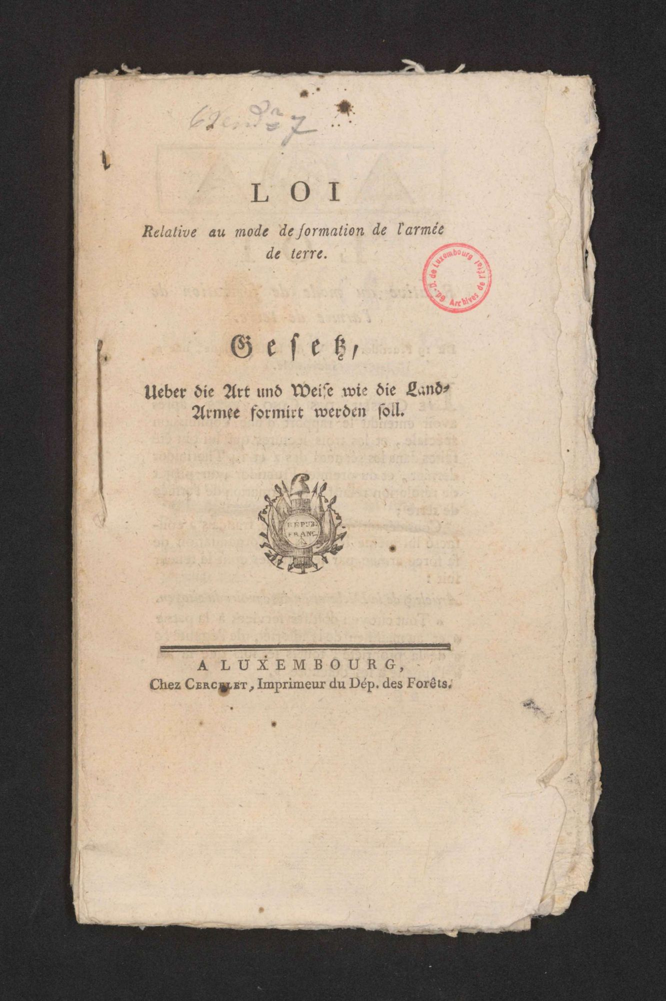 Suite au vote de la « loi relative au mode de formation de l’armée de terre » par le Conseil des Cinq-Cents à Paris le 19 fructidor an VI (5 septembre 1798), la conscription, c’est-à-dire le service militaire obligatoire, est instituée. Cette loi, communément appelée loi Jourdan-Delbrel, fut imprimée et publiée en 12.000 exemplaires à Luxembourg, chef-lieu du département des Forêts, le 6 vendémiaire an VII (27 septembre 1798) pour être affichée et proclamée dans toutes les communes.